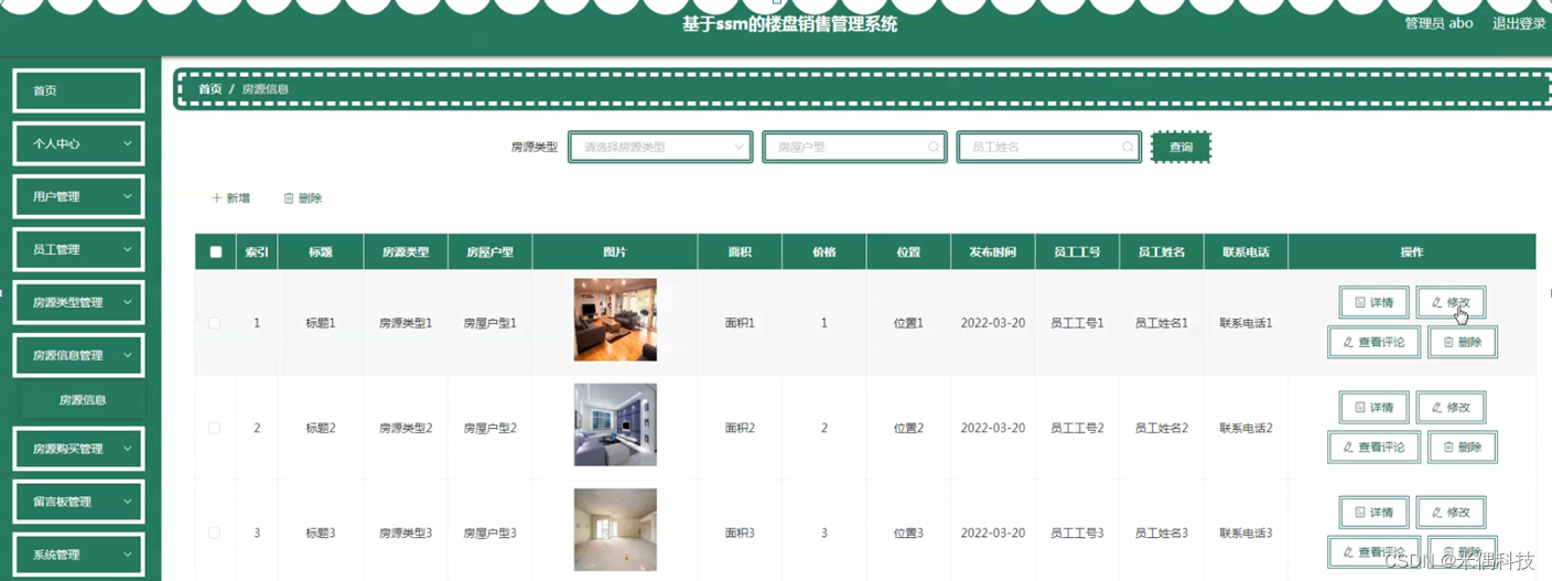 房源信息管理,在房源信息管理页面可以对标题、房源类型、房屋户型、图片、面积、价格、位置、发布时间、员工工号、员工姓名、联系电话等内容进行查看详情、修改、查看评论、删除或新增等操作,如图5-11所示。