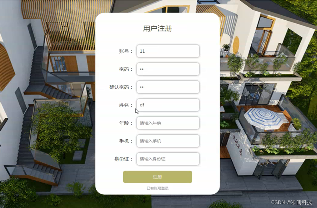 用户如果想在平台前台进行其他操作,则需要注册和登录,点击用户注册,通过填写账号、密码、确认密码、姓名、年龄、手机、身份证等信息完成会用户册操作,用户注册后,输入用户账号和密码登录到系统前台,如图5-2所示。