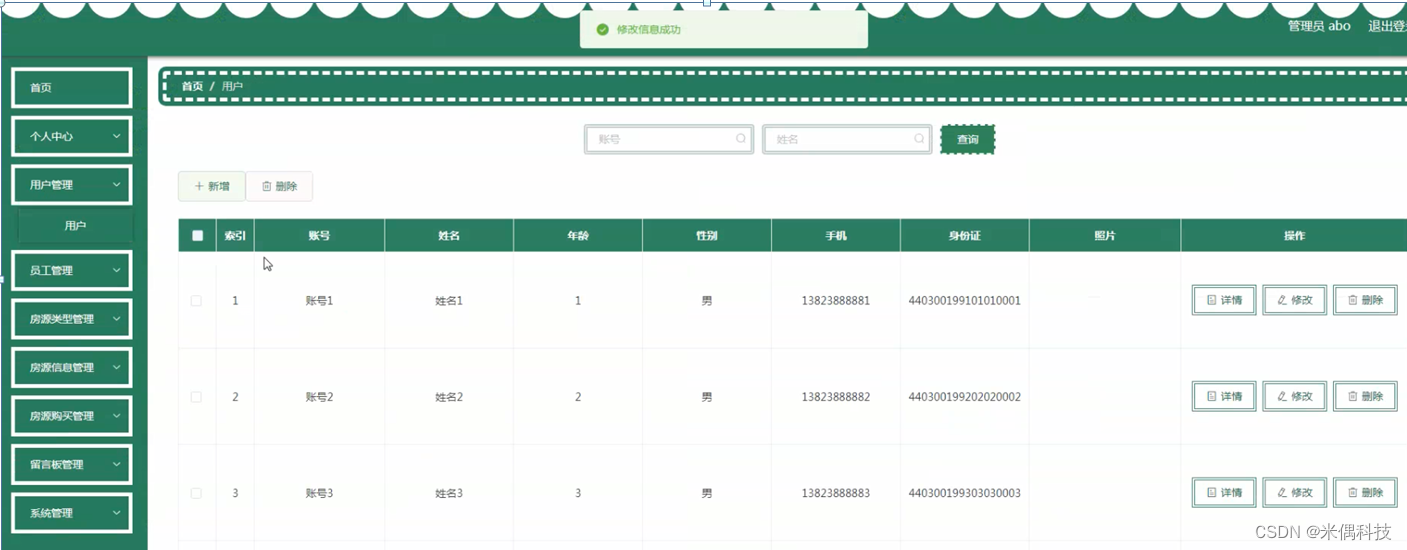 用户管理,在用户管理页面可以对账号、姓名、年龄、性别、手机、身份证、照片等内容进行详情、修改或删除、新增等操作,如图5-9所示。