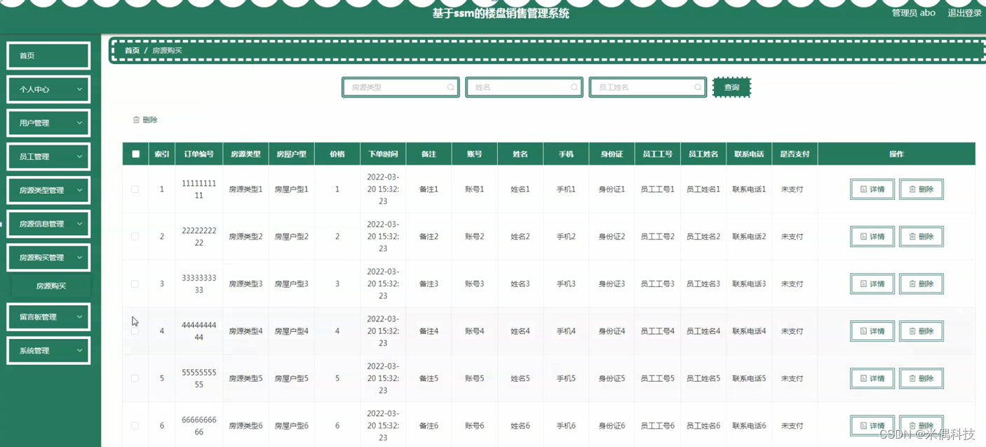 房源购买管理,在房源购买管理页面可以对订单编号、房源类型、房屋户型、价格、位置、下单时间、备注、账号、姓名、手机、身份证、员工工号、员工姓名、联系电话、是否支付等内容进行查看详情、删除等操作,如图5-12所示。