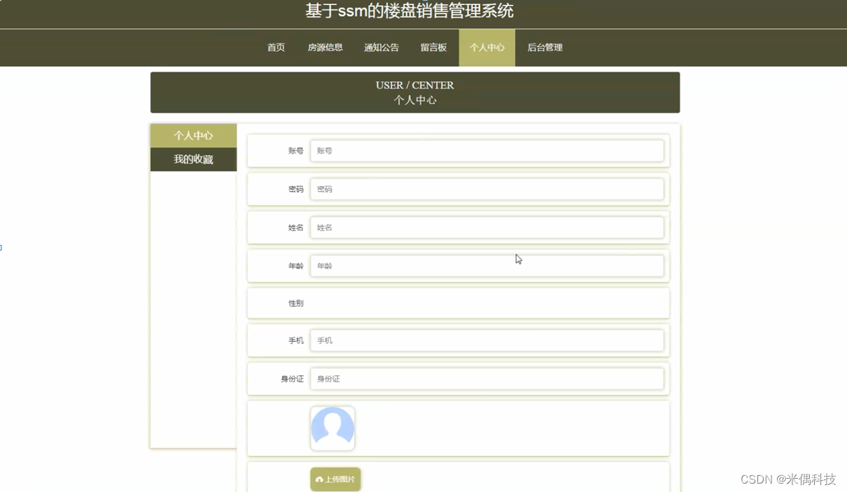 个人中心,在个人信息页面通过填写账号、密码、姓名、年龄、性别、手机、身份证、图片等来更新个人信息,还可以根据需要对我的收藏进行相对应操作,如图5-5所示。