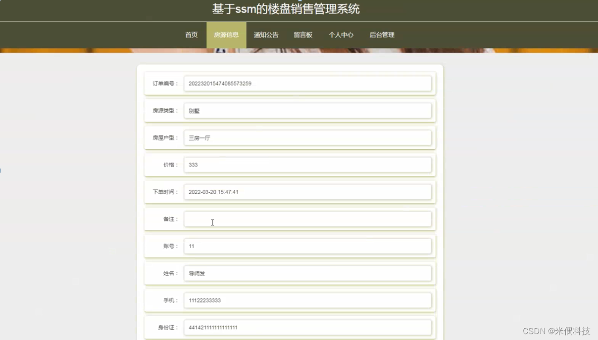 在房源信息页面,点击房源购买,通过填写订单编号、房源类型、房屋户型、价格、下单时间、备注、账号、姓名、手机、身份证、员工工号、员工姓名、联系电话等信息,点击提交进行房源购买申请的操作;如图5-4所示。