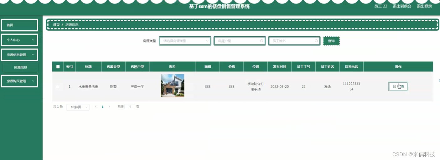 在房源信息管理页面,员工可以查看标题、房源类型、房屋户型、图片、面积、价格、位置、发布时间、员工工号、员工姓名、联系电话等信息,并通过输入房源类型、房屋户型、员工姓名等关键字来查询房源信息,如图5-15所示。