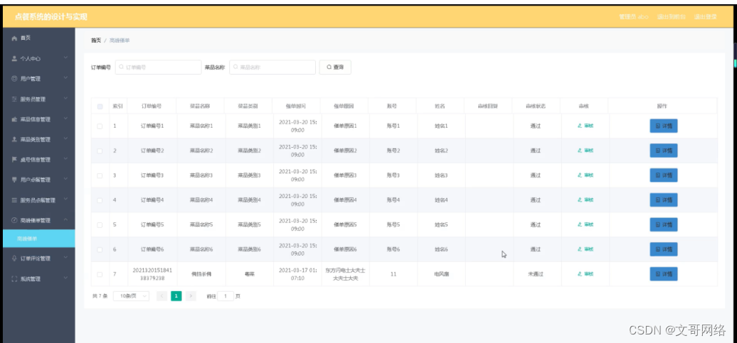 高峰催单管理,在高峰催单管理页面中可以对索引、订单编号、菜品名称、菜品类别、催单时间、催单原因、账号、姓名、审核回复、审核状态、审核等信息进行详情等操作,如图5-14所示。