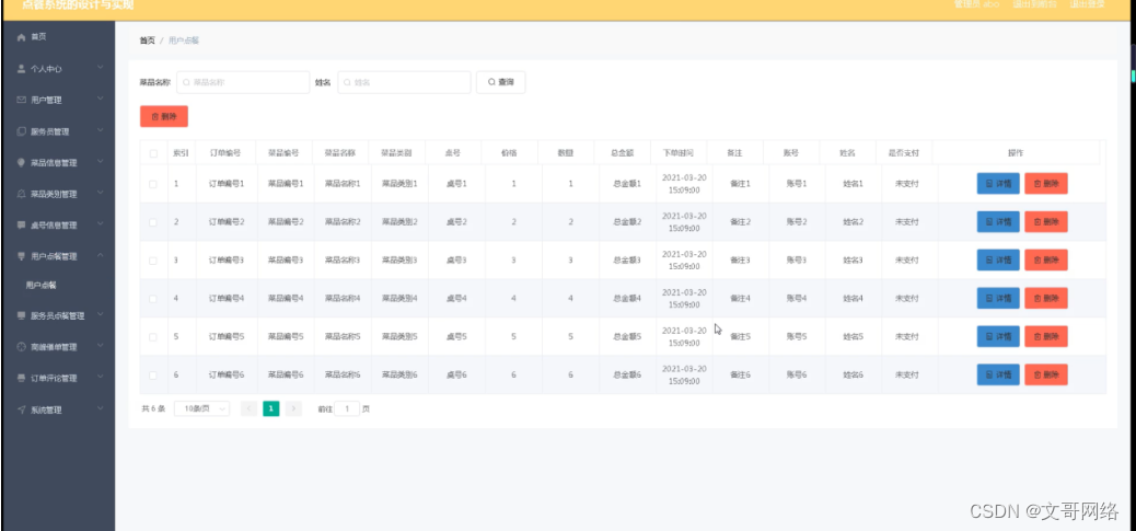 用户点餐管理,在用户点餐管理页面中可以对索引、订单编号、菜品编号、菜品名称、菜品类别、桌号、价格、数量、总金额、下单时间、备注、账号、姓名、是否支付等信息进行详情、删除等操作,如图5-12所示。