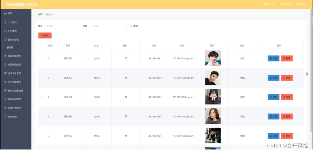 服务员管理,在服务员管理页面中可以对索引、账号、姓名、性别、手机、邮箱、照片、地址等信息进行详情、删除等操作,如图5-8所示。