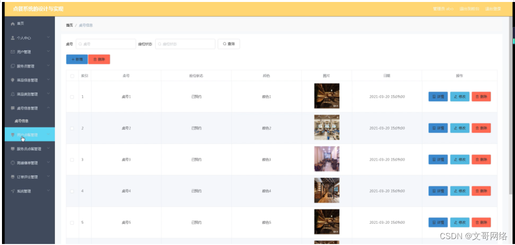 桌号信息管理,在桌号信息管理页面中可以对索引、桌号、座位状态、颜色、图片、日期等信息进行详情、修改或删除等操作,如图5-11所示。