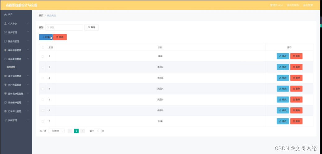 菜品类别管理,在菜品类别管理页面中可以对索引、类别等信息进行修改、删除等操作,如图5-10所示。