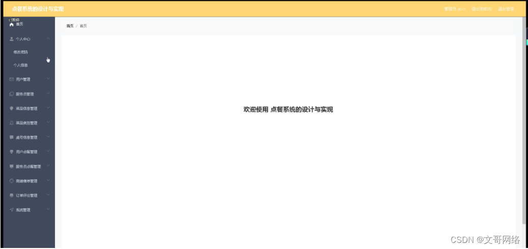 管理员登录进入系统之后,就可以对所有的信息进行查看,可以查看到首页、个人中心、用户管理、服务员管理、菜品信息管理、菜品类别管理、桌号信息管理、用户点餐管理、服务员点餐管理、高峰催单管理、订单评论管理、系统管理等,并且还可以对其进行相应的操作管理,如图5-6所示。