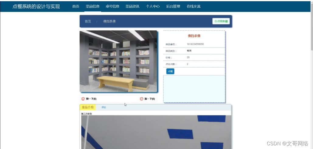 菜品信息,在菜品信息页面中可以查看菜品名称、菜品编号、菜品类别、价格、点击次数、菜品介绍、图片等信息,并进行评论、收藏或点赞;如图5-2所示。