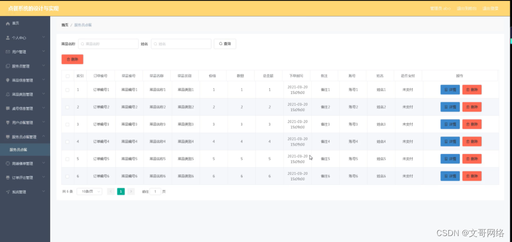 服务员点餐管理,在服务员点餐管理页面中可以对索引、订单编号、菜品编号、菜品名称、菜品类别、价格、数量、总金额、下单时间、备注、账号、姓名、是否支付等信息进行详情、删除等操作,如图5-13所示。