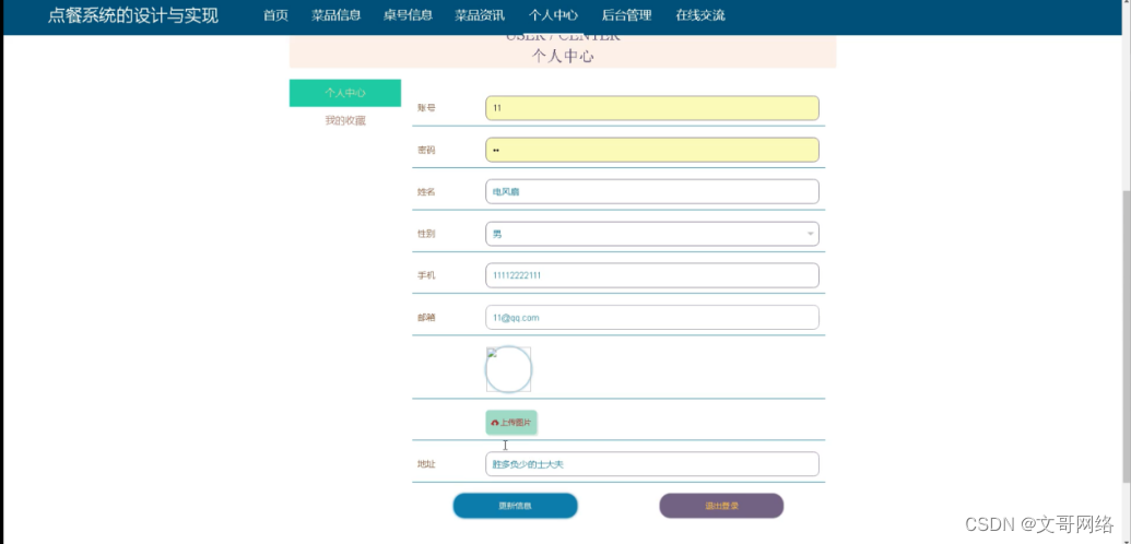 个人中心,在个人中心页面通过填写账号、密码、姓名、性别、手机、邮箱、上传图片、地址等信息进行个人信息更新信息,根据需要我的收藏进行操作,如图5-4所示。