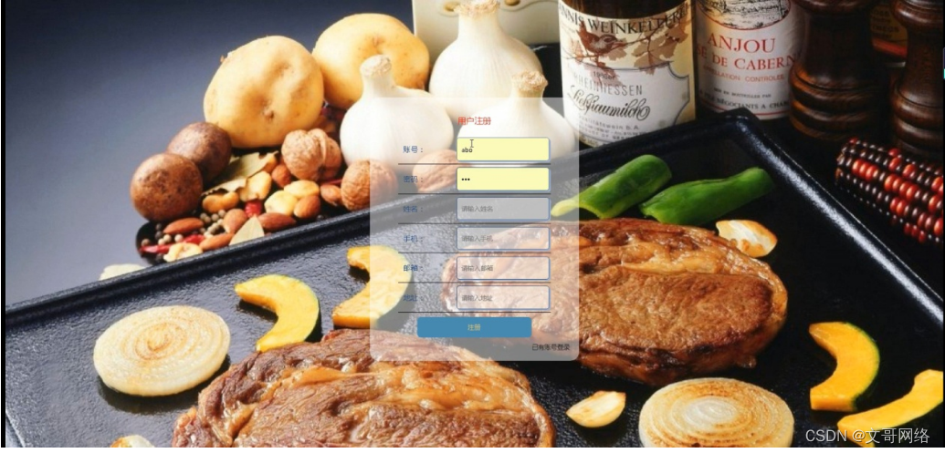 用户注册,在用户注册页面通过填写账号、密码、姓名、手机、邮箱、地址等信息完成用户注册,如图5-3所示。
