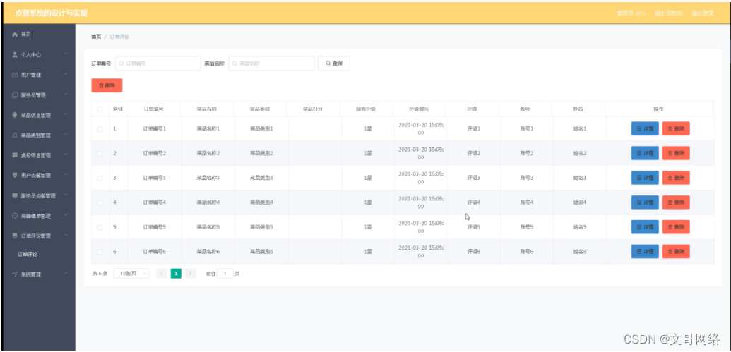 订单评论管理,在订单评论管理页面中可以对索引、订单编号、菜品名称、菜品类别、菜品打分、服务评价、评价时间、评语、账号、姓名等信息进行详情、删除等操作,如图5-15所示。