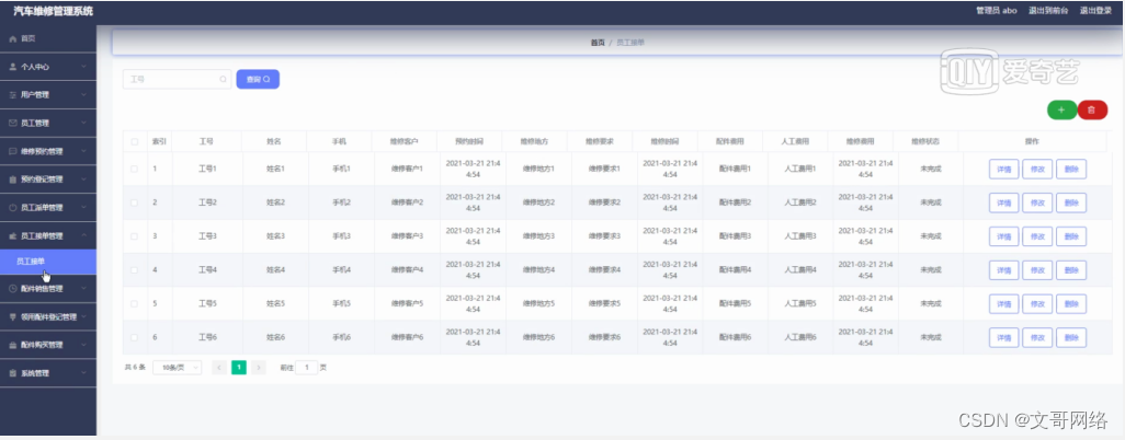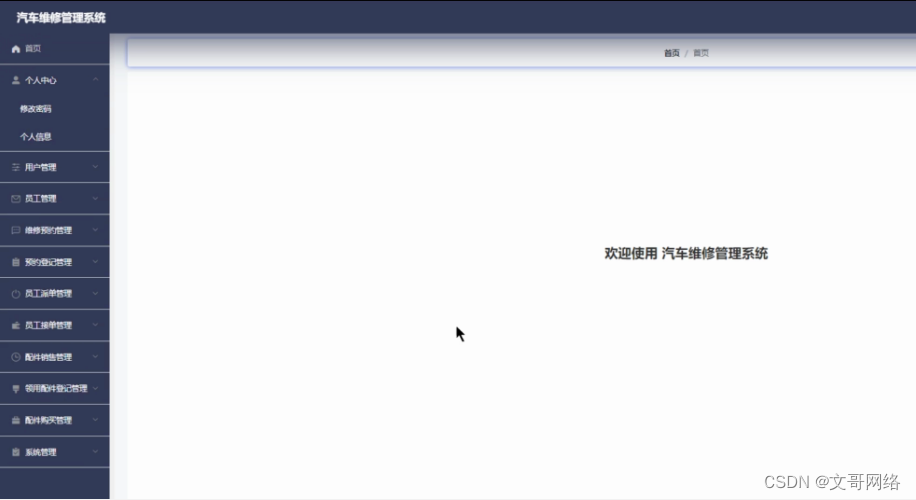 2、管理员;实现首页、个人中心、用户管理、员工管理、维修预约管理、预约登记管理、员工派单管理、员工接单管理、配件销售管理、领用配件登记管理、配件购买管理、系统管理等模块信息的查看及相应操作;