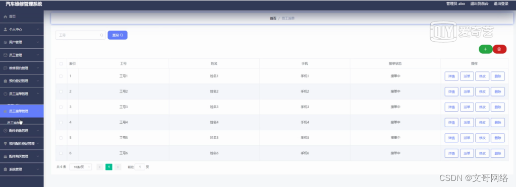 员工接单管理:通过列表可以获取学工号、姓名、手机、维修客户、预约时间、维护地方等信息,进行查看详情、修改或删除操作,如图5-14所示。