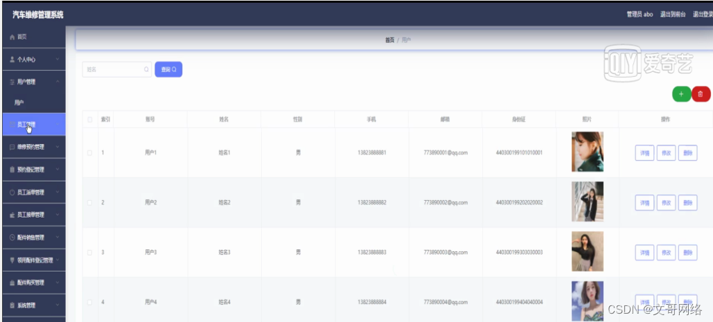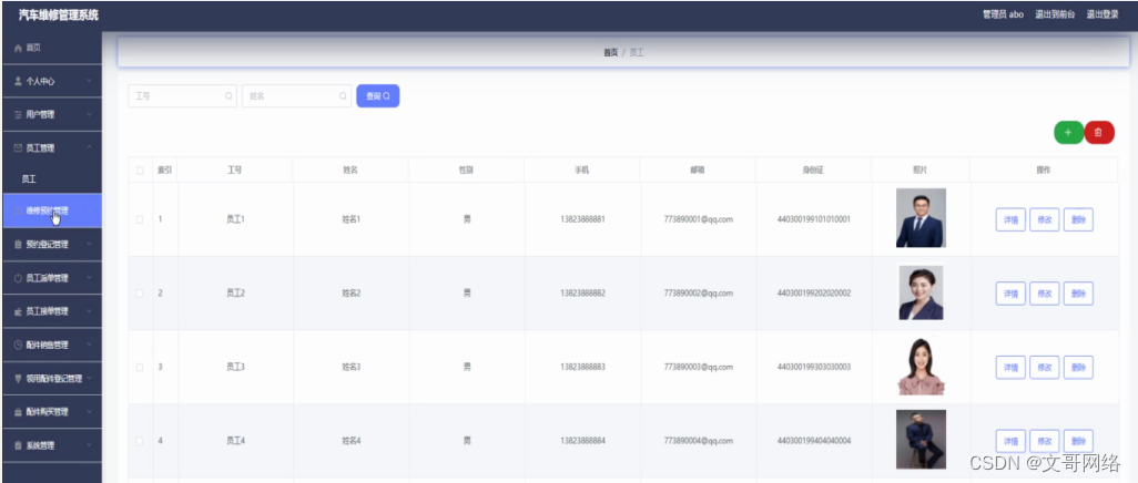 员工管理,管理员通过员工管理可以在线查看工号、姓名、性别、手机、邮箱、身份证、图片等信息,进行新增或修改、删除操作,如图5-10所示。