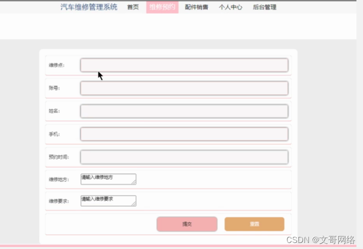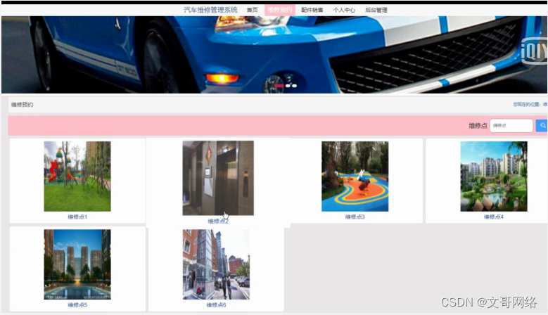 用户通过登录进入到汽车维修管理系统前台,可以查看首页、维修预约、配件销售、个人中心、后台管理等内容,并进行相关操作,如图5-1所示。