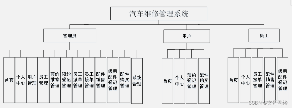 汽车维修管理系统,主要包括管理员、用户、员工三个用户角色,对于用户角色不同,所使用的功能模块相应不同。