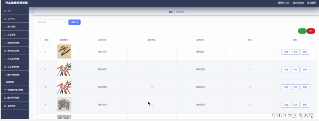 配件销售管理:通过列表可以获取配件图片、配件名称、配件数量、配件型号、价格等信息,进行查看详情、修改或删除操作,如图5-15所示。