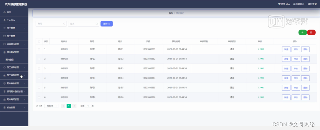 预约登记管理:通过列表可以获取维修点、账号、姓名、手机、预约时间、审核等信息,进行查看、修改或删除操作,如图5-12所示。