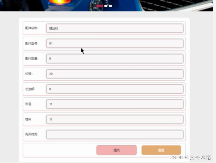 购买,在配件购买信息页面查看后,用户可根据自己的需要点击购买按钮,通过填写配件名称、配件型号、配件数量、价格、总金额、账号、姓名、购买时间等信息进行在线购买的提交,如图5-5所示。