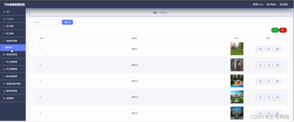 维修预约管理,管理员通过维修预约管理可以在线查看维修点、图片等信息,进行查看详情或修改或删除等操作,如图5-11所示。