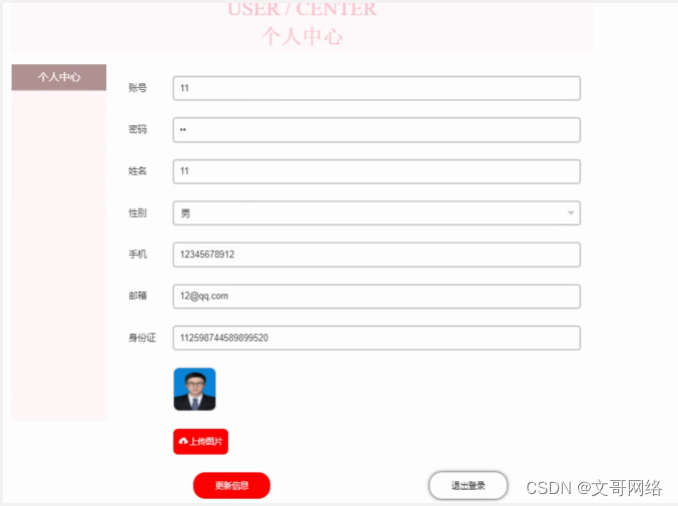 在个人中心页面,用户可以对账号、密码、姓名、性别、手机、邮箱、身份证、图片等内容信息更新,如图5-6所示。