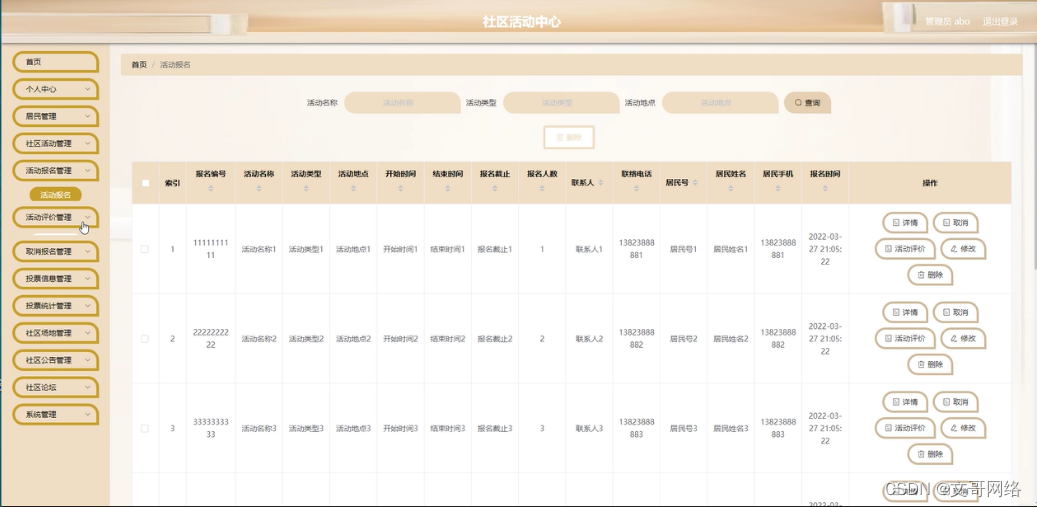 管理员点击活动报名管理。在活动报名页面输入活动名称、活动类型、活动地点进行查询或删除活动报名列表,并根据需要对活动报名详情信息进行详情、取消、活动评价、修改或删除操作;如图5-10所示: