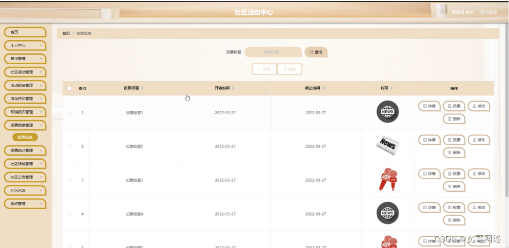 管理员点击投票信息管理。在投票信息页面输入投票标题进行查询、新增或删除投票信息列表,并根据需要对投票详情信息进行详情、投票、修改或删除操作;如图5-13所示: