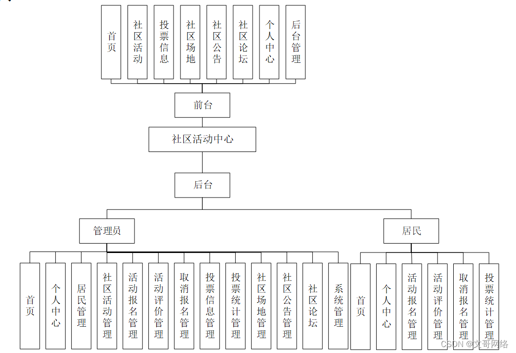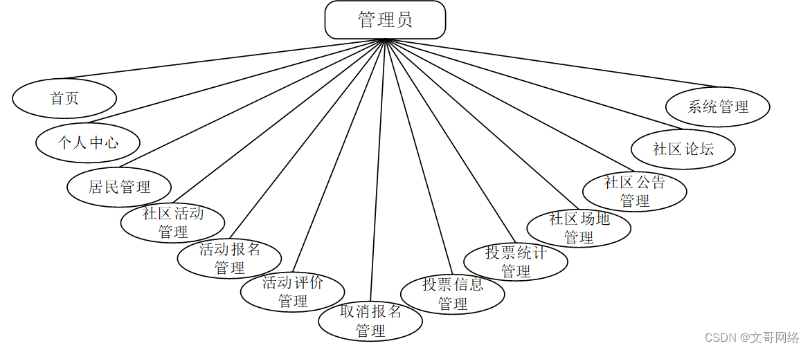 (2)管理员可以对首页、个人中心、居民管理、社区活动管理、活动报名管理、活动评价管理、取消报名管理、投票信息管理、投票统计管理、社区场地管理、社区公告管理、社区论坛、系统管理等进行基本的信息管理。其用例分析如图3-2所示。