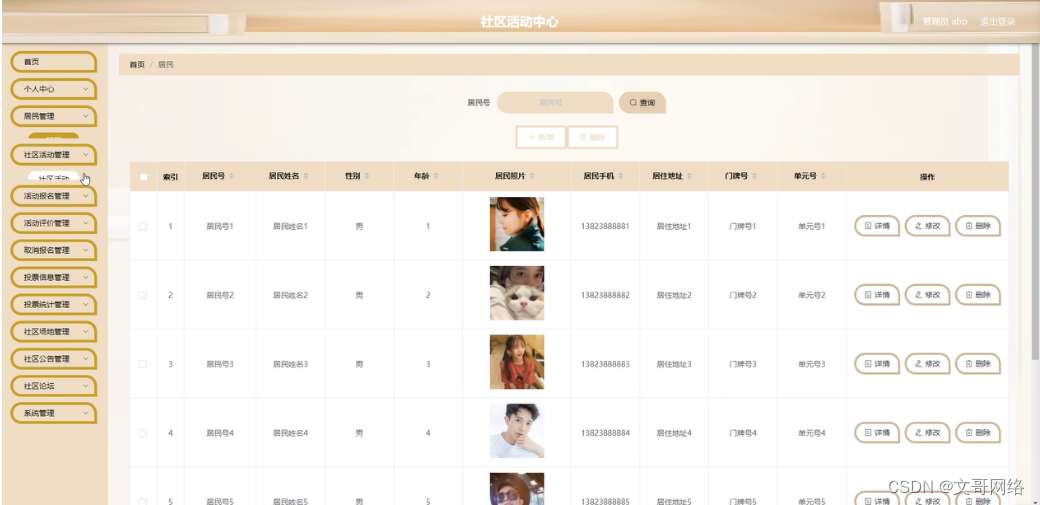 管理员点击居民管理。在居民页面输入居民号进行查询、新增或删除居民列表,并根据需要对居民详情信息进行详情、修改或删除操作;如图5-8所示:
