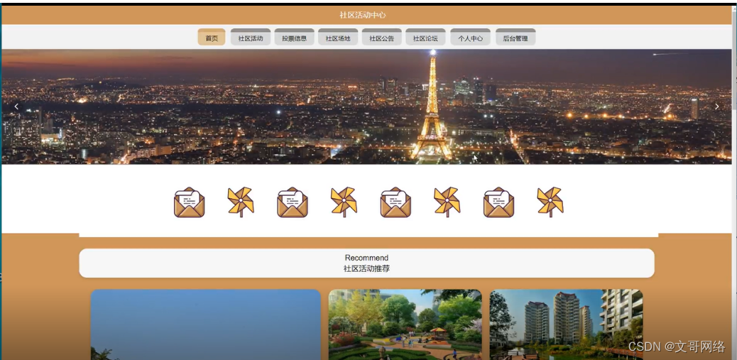 当人们打开系统的网址后,首先看到的就是首页界面。在这里,人们能够看到社区活动中心的导航条,通过导航条导航进入各功能展示页面进行操作。系统首页界面如图5-1所示: