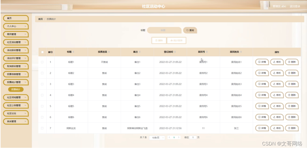 管理员点击投票统计管理。在投票统计页面输入标题进行查询、删除或统计报表投票统计列表,并根据需要对投票统计详情信息进行详情、修改或删除操作;如图5-14所示:
