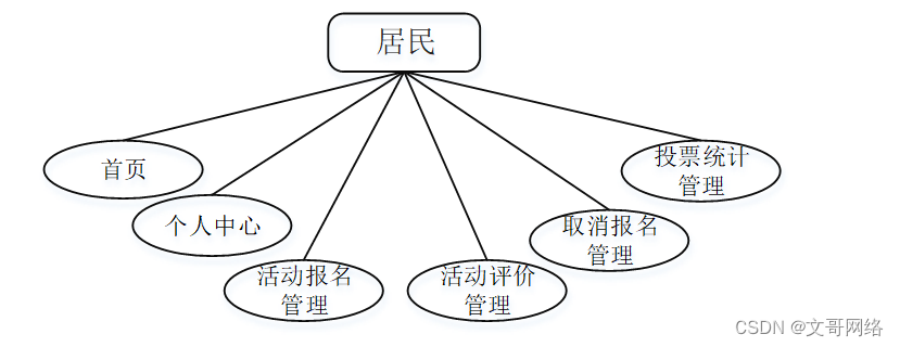 (3)居民可以对首页、个人中心、活动报名管理、活动评价管理、取消报名管理、投票统计管理等功能进行相应操作,用例分析如图3-3所示。