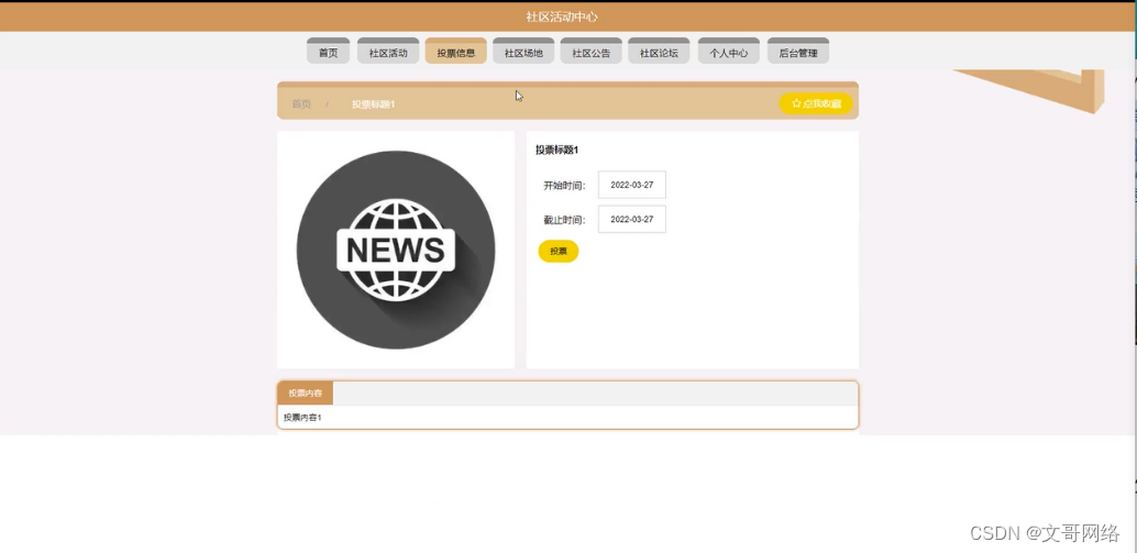 投票信息:在投票信息页面的输入栏中输入投票标题、开始时间、截止时间进行查询,可以查看到投票详细信息,并进行投票操作,投票信息页面如图5-4所示: