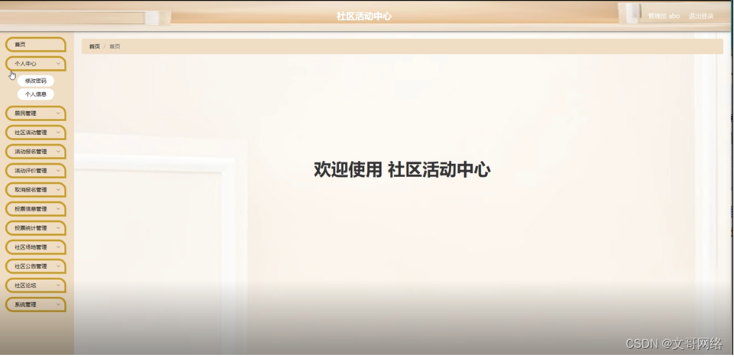 管理员进入主页面,主要功能包括对首页、个人中心、居民管理、社区活动管理、活动报名管理、活动评价管理、取消报名管理、投票信息管理、投票统计管理、社区场地管理、社区公告管理、社区论坛、系统管理等进行操作。管理员主页面如图5-7所示: