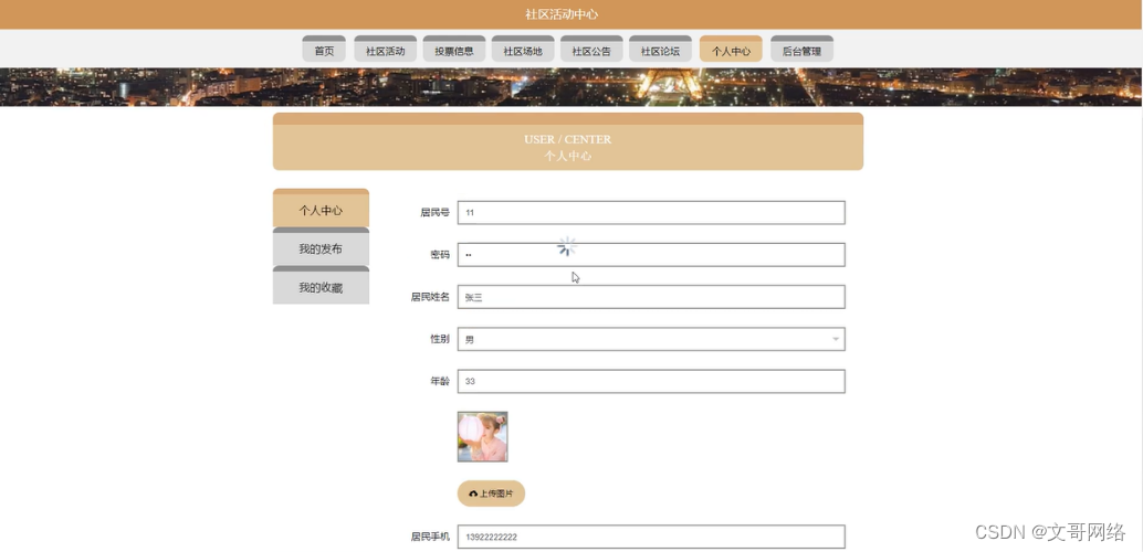 个人中心:在个人中心页面通过填写个人详细信息进行信息更新;并根据需要对我的发布、我的收藏进行相应操作;如图5-5所示: