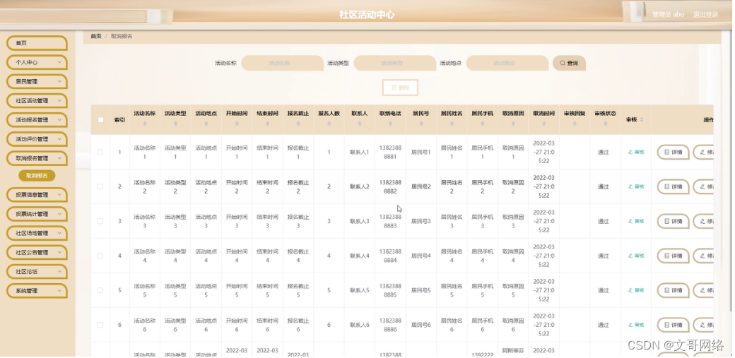管理员点击取消报名管理。在取消报名页面输入活动名称、活动类型、活动地点进行查询或删除取消报名列表,并根据需要对取消报名详情信息进行详情、修改或删除操作;如图5-12所示: