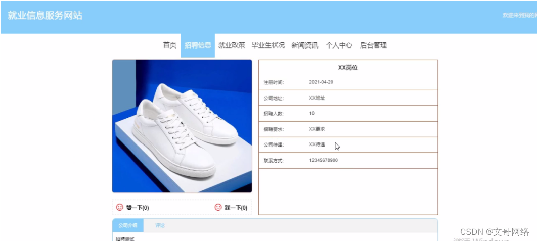招聘信息,在招聘信息页面可以查看岗位名称、图片、注册时间、公司地址、招聘人数、招聘要求、公司待遇、联系方式、公司介绍等内容,用户可根据需要进行收藏、赞、踩、评论等操作,如图5-2所示。