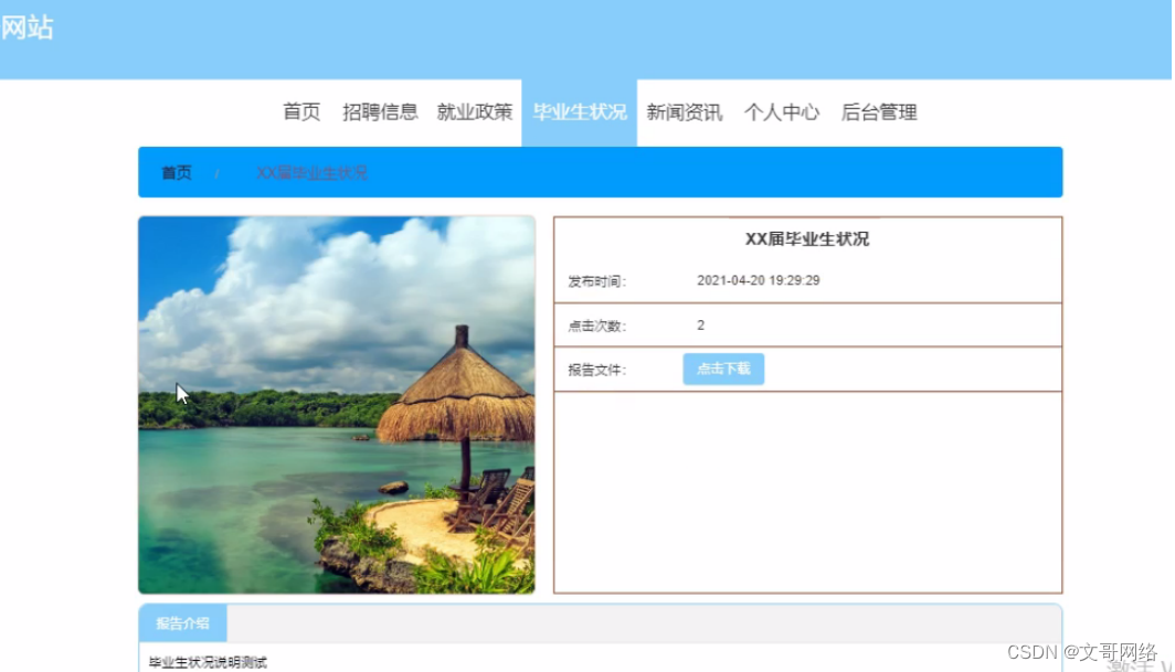 在毕业生状况页面,管理员可以查看学生状况标题、图片、发布时间、点击次数、报告文件、报告介绍等内容,用户可以进行下载报告文件,如图5-4所示。