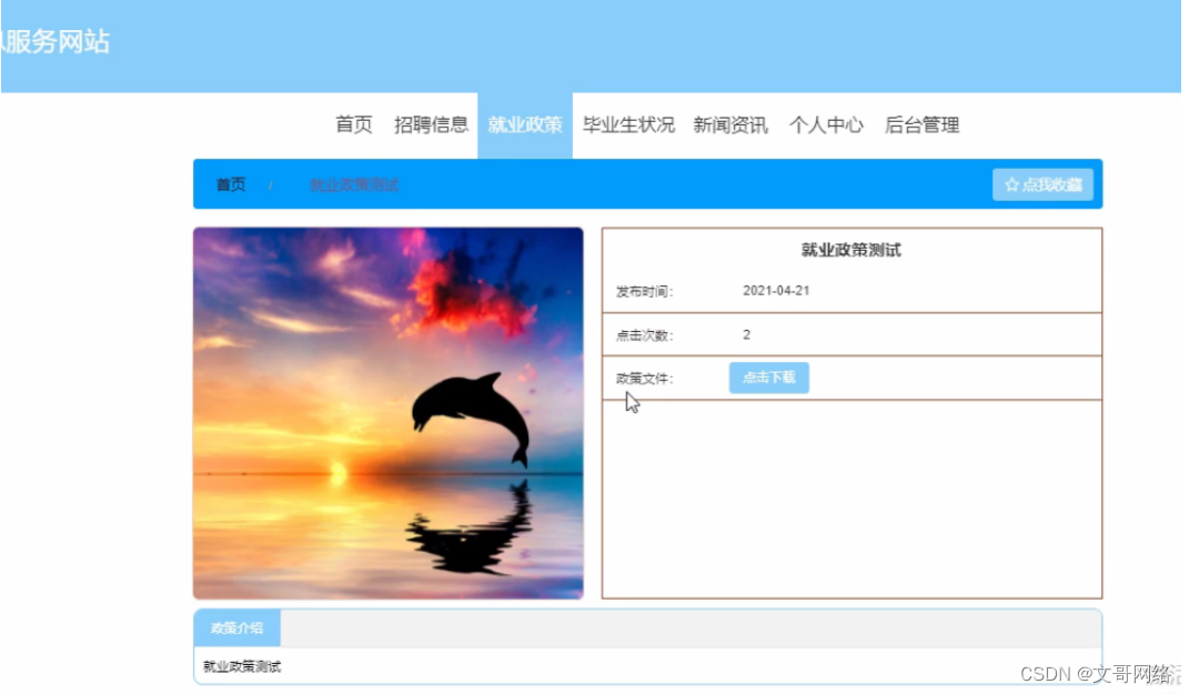 在就业政策页面,用户可以查看就业政策标题、图片、发布时间、点击次数、政策文件、政策介绍等内容,用户可以进行收藏、下载政策文件等操作,如图5-3所示。
