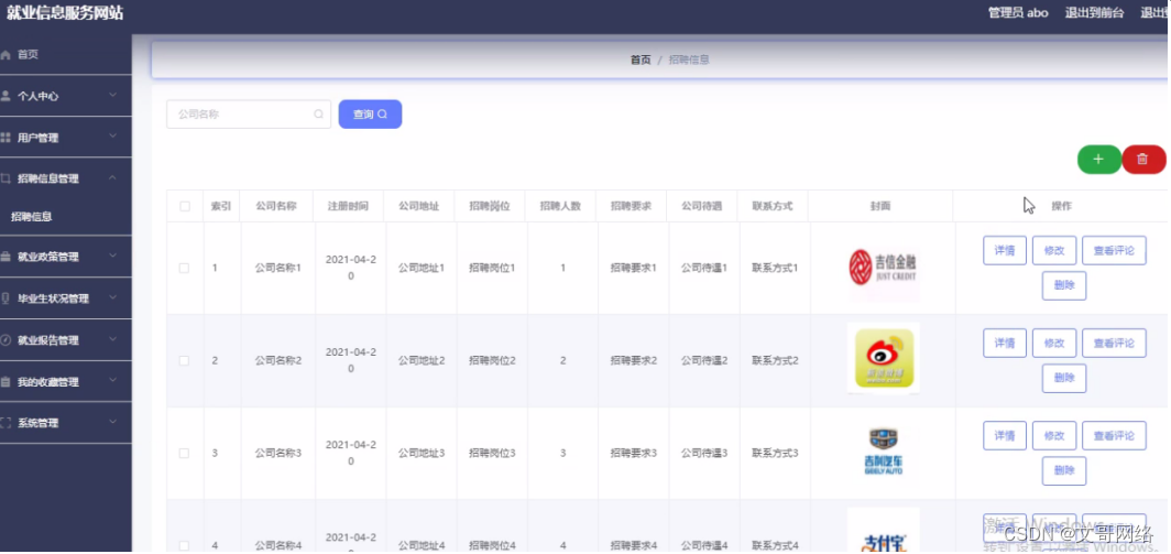 招聘信息管理,在招聘信息管理页面中可以查看公司名称、注册时间、公司地址、招聘岗位、招聘人数、招聘要求、公司待遇、联系方式、封面等信息,还可以根据需要进行新增、修改、删除、查看评论等操作,如图5-9所示。