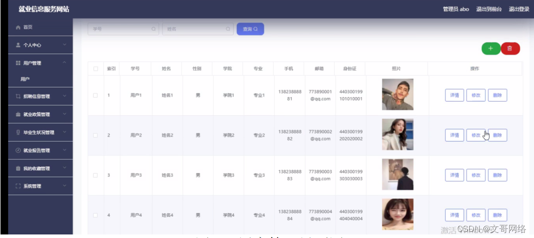 用户管理,在用户管理页面中可以查看学号、姓名、性别、学院、专业、手机、邮箱、身份证、照片等信息,还可以根据需要进行新增、修改或删除等操作,如图5-8所示。