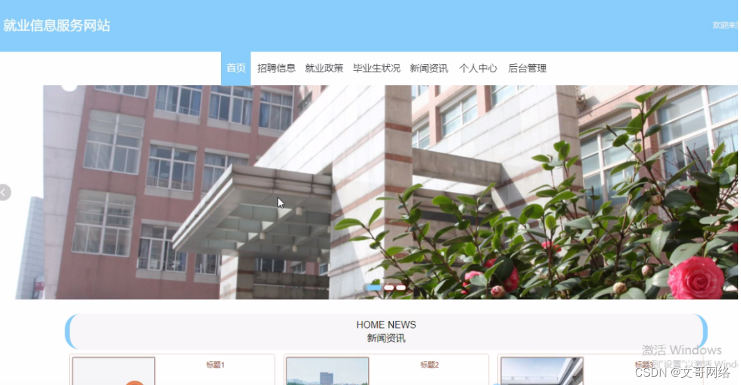 就业信息服务网站,在系统的首页可以查看首页、招聘信息、就业政策、毕业生状况、新闻资讯、个人中心、后台管理等信息,如图5-1所示。