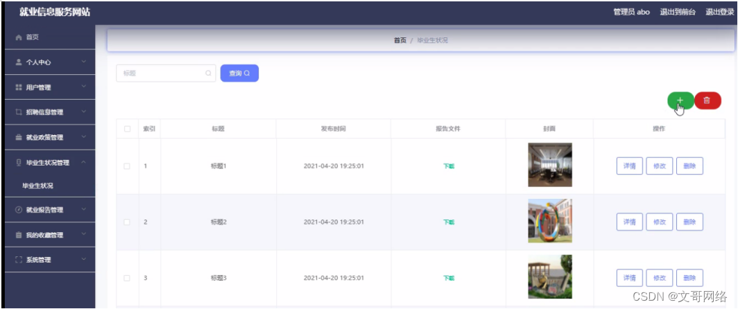 毕业生状况管理,在毕业生状况管理界面中可以查看标题、发布时间、报告文件、封面等内容,管理员可以进行新增、修改、删除等操作,如图5-11所示。