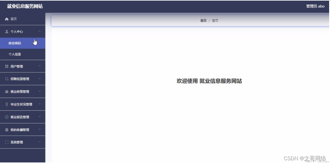 管理员登录进入就业信息服务网站后可以查看首页、个人中心、用户管理、招聘信息管理、就业信息管理、毕业生状况管理、就业报告管理、我的收藏管理、系统管理等内容,如图5-7所示。