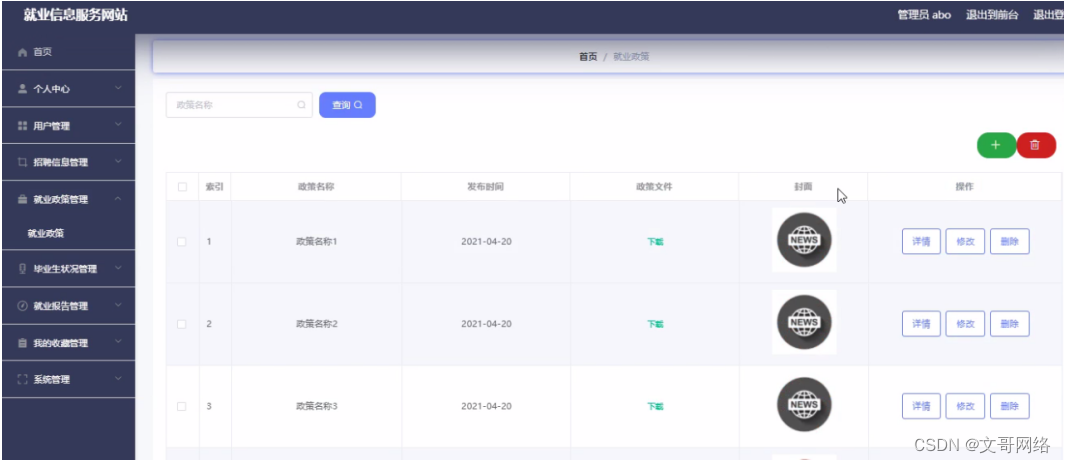 就业政策管理,在就业政策管理页面中可以查看政策名称、发布时间、政策文件、封面等信息进行新增、修改或删除等操作,如图5-10所示。