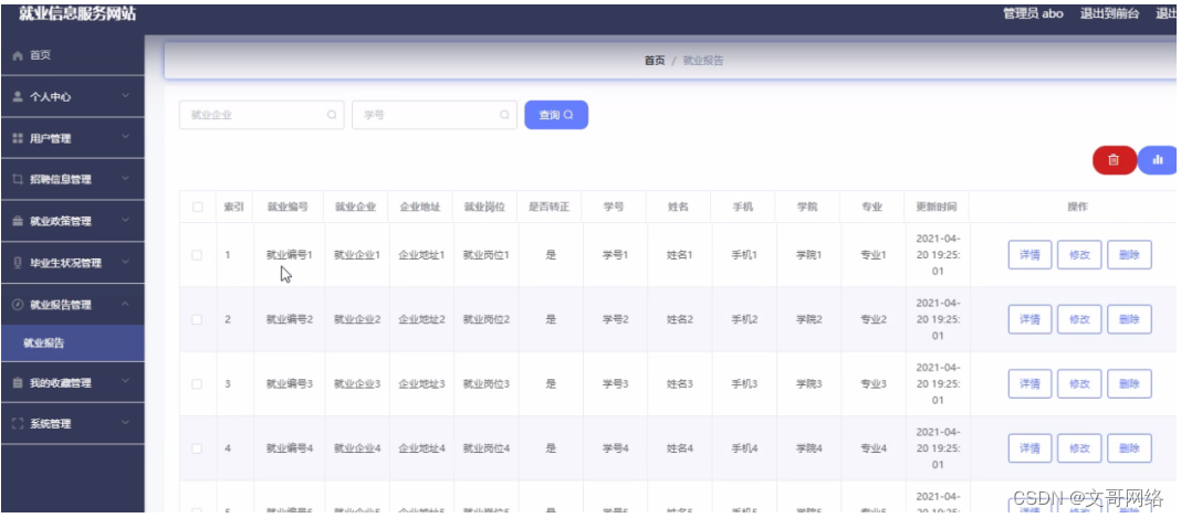 在就业报告管理页面,管理员可以查看就业编号、就业企业、企业地址、就业岗位、是否转正、学号、姓名、手机、学院、专业、更新时间等内容,并根据权限进行修改、删除、查看统计图等操作,如图5-12所示。