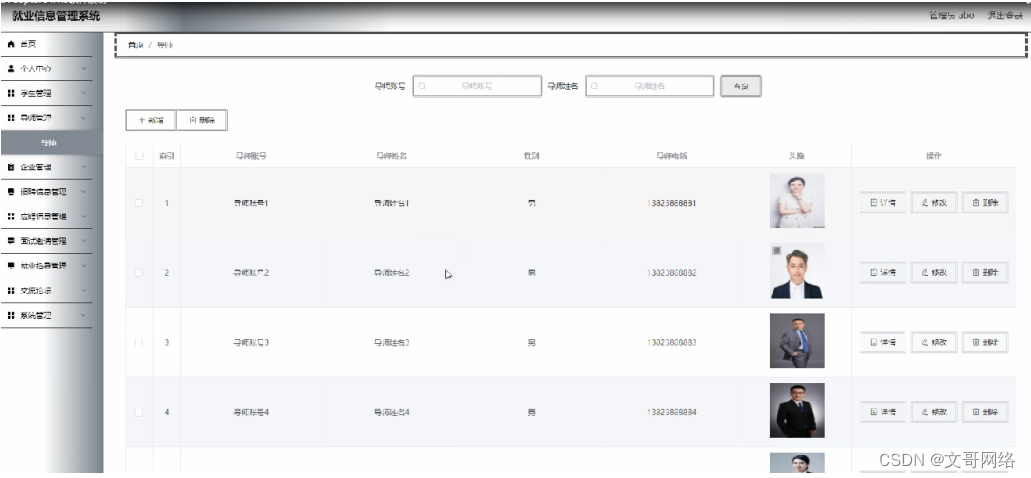 导师管理;在导师管理页面中可以查看索引,导师账号,导师姓名,性别,导师电话,头像等内容,并进行详情,修改和删除等操作;如图4-8所示。